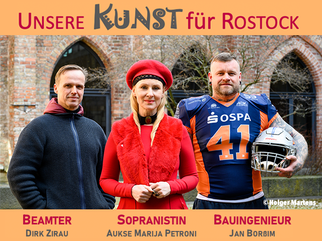 In der Mitte der Fotos ist jeweils eine Rostocker Künstlerin, bzw. ein Rostocker Künstler zu sehen, umgeben von zwei weiteren Rostocker Berufen. Denn "wir alle sind KÜNSTLER/INNEN in und für Rostock!" - jeder auf seine Art und Weise und wir funktionieren nur gemeinsam als STADT und gemeinsam machen wir das LEBEN SCHÖN!